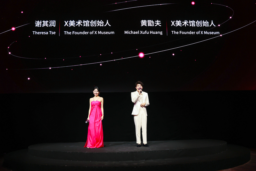 Theresa Tse (left) and Huang Xufu (right), co-founders of X Museum, speak at the gala event “The New GalaXy” on May 27, 2023, in Beijing. [Photo provided to chinadaily.com.cn]