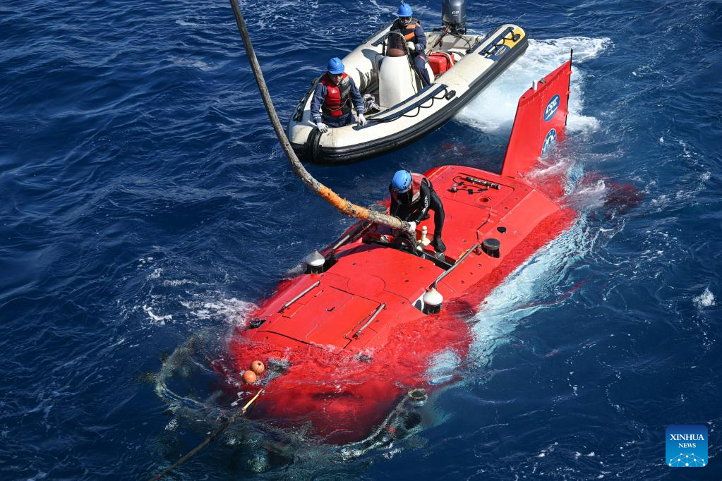 A hydronaut unhitches the rope on the crewed submersible Shenhai Yongshi (Deep Sea Warrior) from the scientific research ship Tansuo-1 to make preparations for underwater investigation in the South China Sea, May 26, 2023. [Photo/Xinhua]