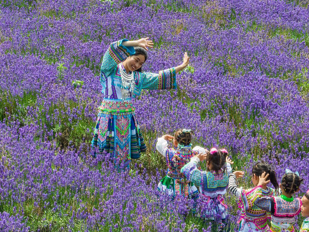 A woman leads children to dance in lavender fields in Lizi village, Bijie, Guizhou province. [Photo/IC]