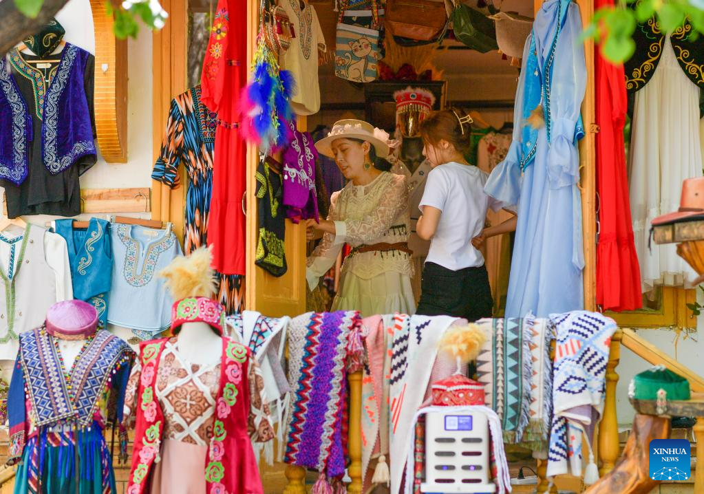Tourists select traditional costumes on Liuxing Street in Yining city, Ili Kazak autonomous prefecture, Northwest China's Xinjiang Uygur autonomous region, May 17, 2023. [Photo/Xinhua]