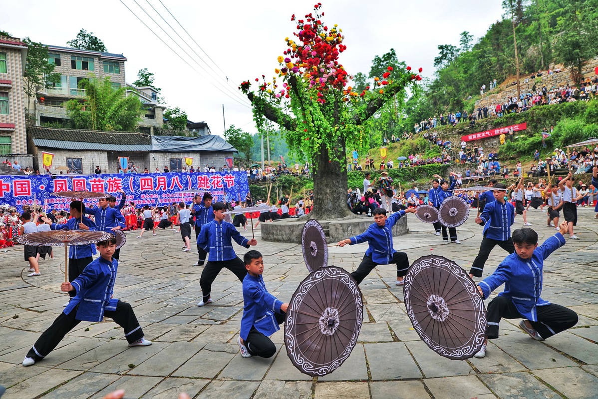 Residents and tourists participate in the Flower-Jumping Festival in Shanjiang township in Fenghuang county of Xiangxi Tujia and Miao autonomous prefecture, Hunan province, on June 2, 2023. [Photo by Wu Donglin/For chinadaily.com.cn]