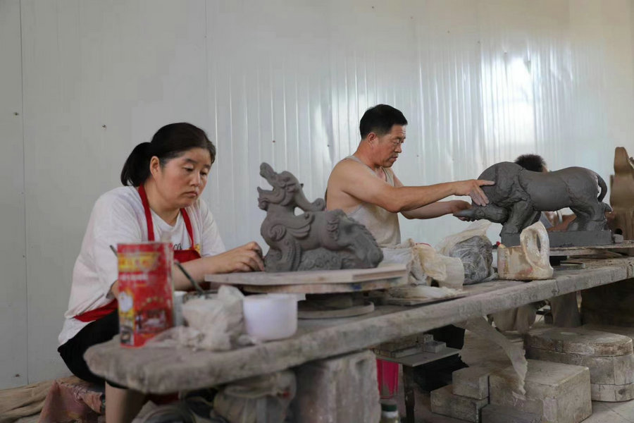 Craftsmen are busy making colored glaze products at the Lyu family factory in Hejin, Shanxi province. The styles are often seen in ancient architecture, such as palaces, tombs, monasteries, temples and pagodas. The skills were listed as a national intangible cultural heritage in 2008. [Photo provided to China Daily]