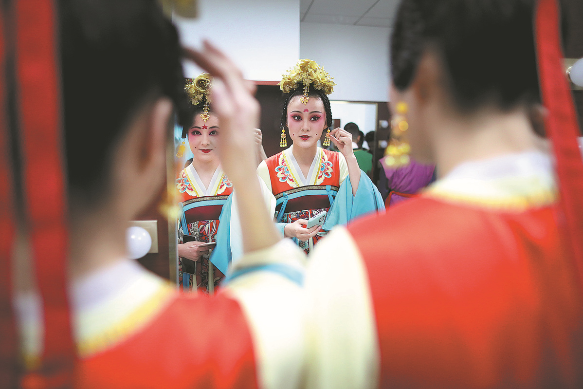 Artists put on their makeup backstage at the Shouyi Theater before the performance on April 16. [Photo by Zhu Xingxin/China Daily]