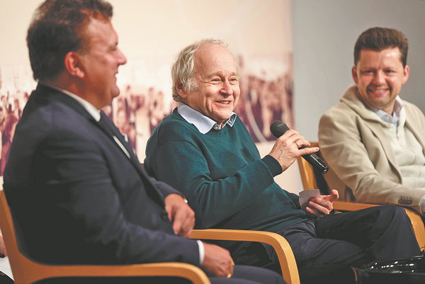 (From left) Jan Nast, intendant of the Wiener Symphoniker, conductor Adam Fischer and violinist Julian Rachlin meet the media at the NCPA on Tuesday. [Photo provided to China Daily]