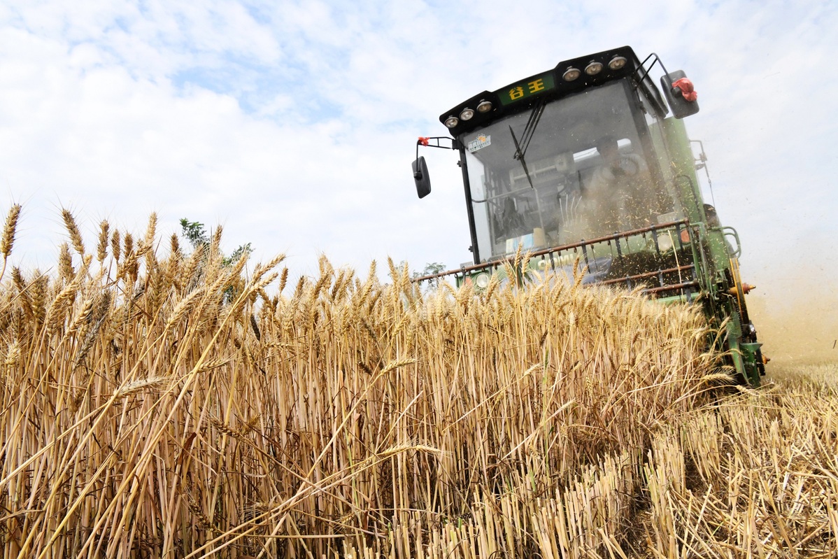 A farmer drives a wheat harvester in Houguzhai village in Guangping county of Handan, Hebei province, on June 4, 2023. [Photo by Cheng Xuehu/For chinadaily.com.cn]