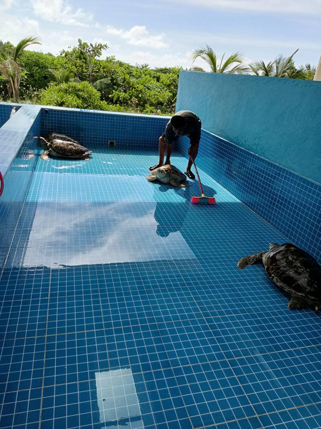 Sometimes the staff comes across newly hatched baby turtles that are too weak to escape from their nests, which are made of stone and sand. They rescue the babies and take care of them until they can survive on their own in the wild. Then they are released into the sea.