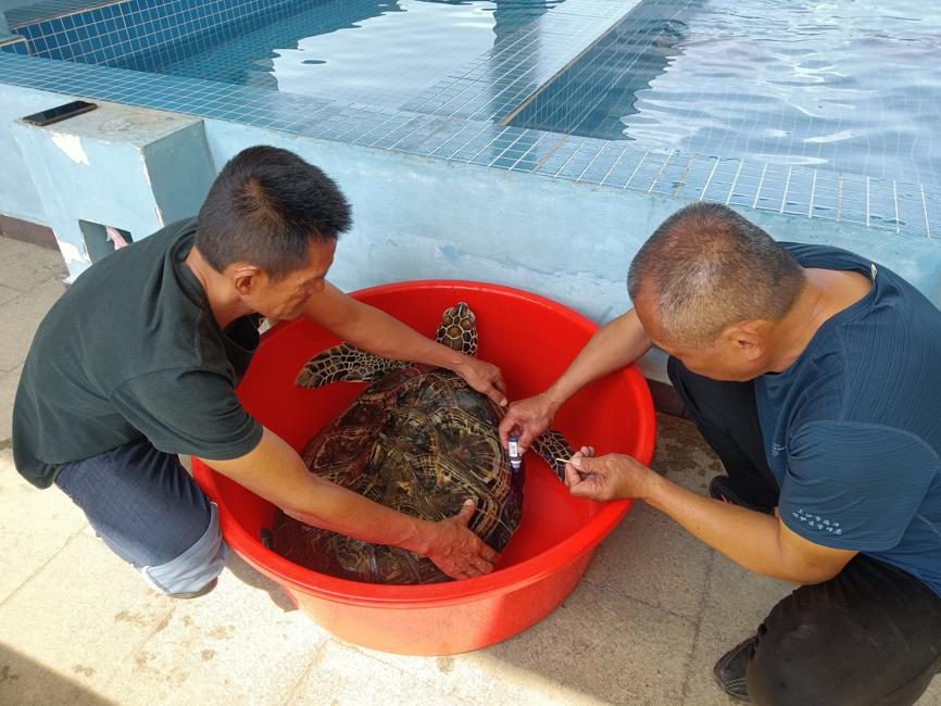 Medicines are applied to rescued sea turtles at the turtle protection center. [Photo by Hou Wenjie/For chinadaily.com.cn]