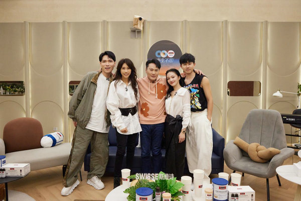(From left to right) Singers Jam Hsiao, Karen Mok, Jeff Chang, Angela Zhang and Zhang Jie pose for a group photo. [Photo provided to China Daily]