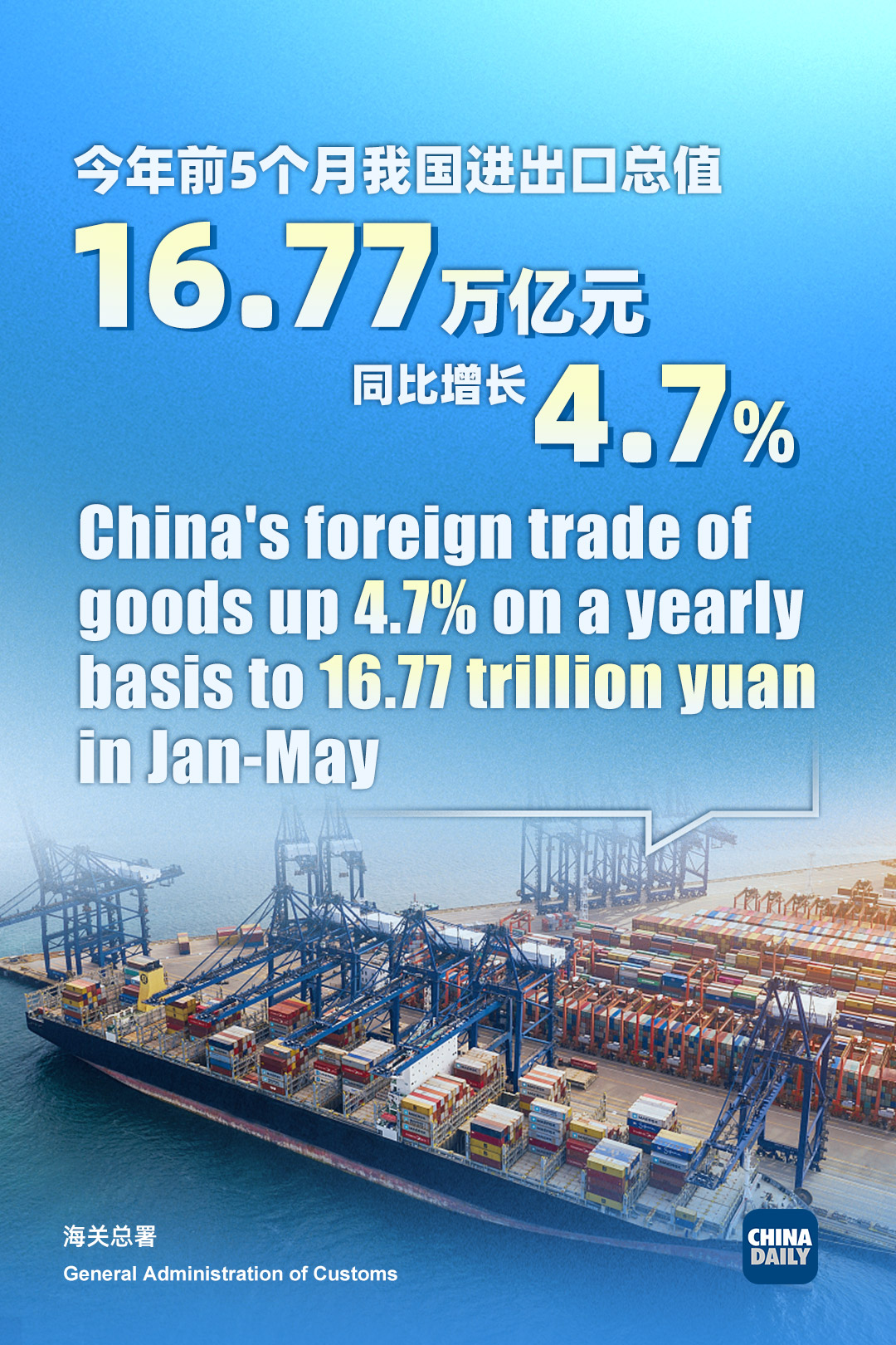 China's total imports and exports grew 4.7 percent year-on-year to 16.77 trillion yuan in the first five months, data from the General Administration of Customs showed on Wednesday.