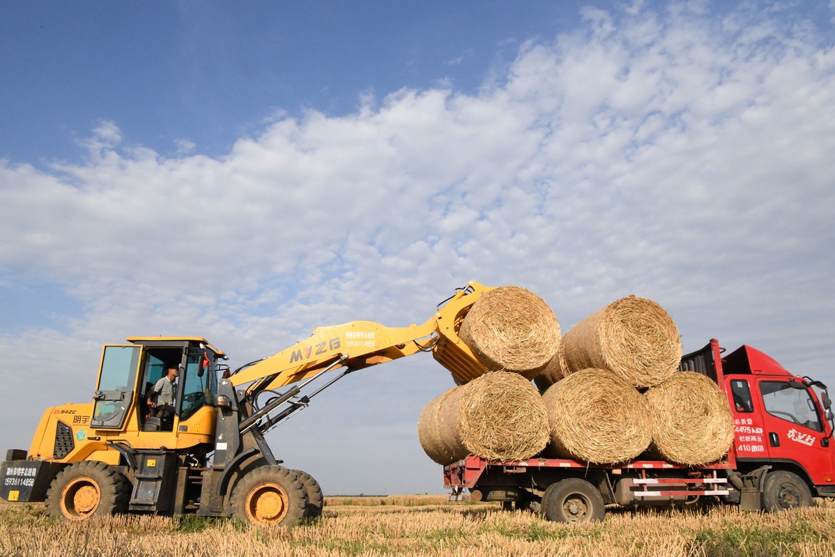 An agricultural machine collects wheat stalks in Guangping county of Handan, Hebei province, on Wednesday. [Photo by Cheng Xuehu/For chinadaily.com.cn]