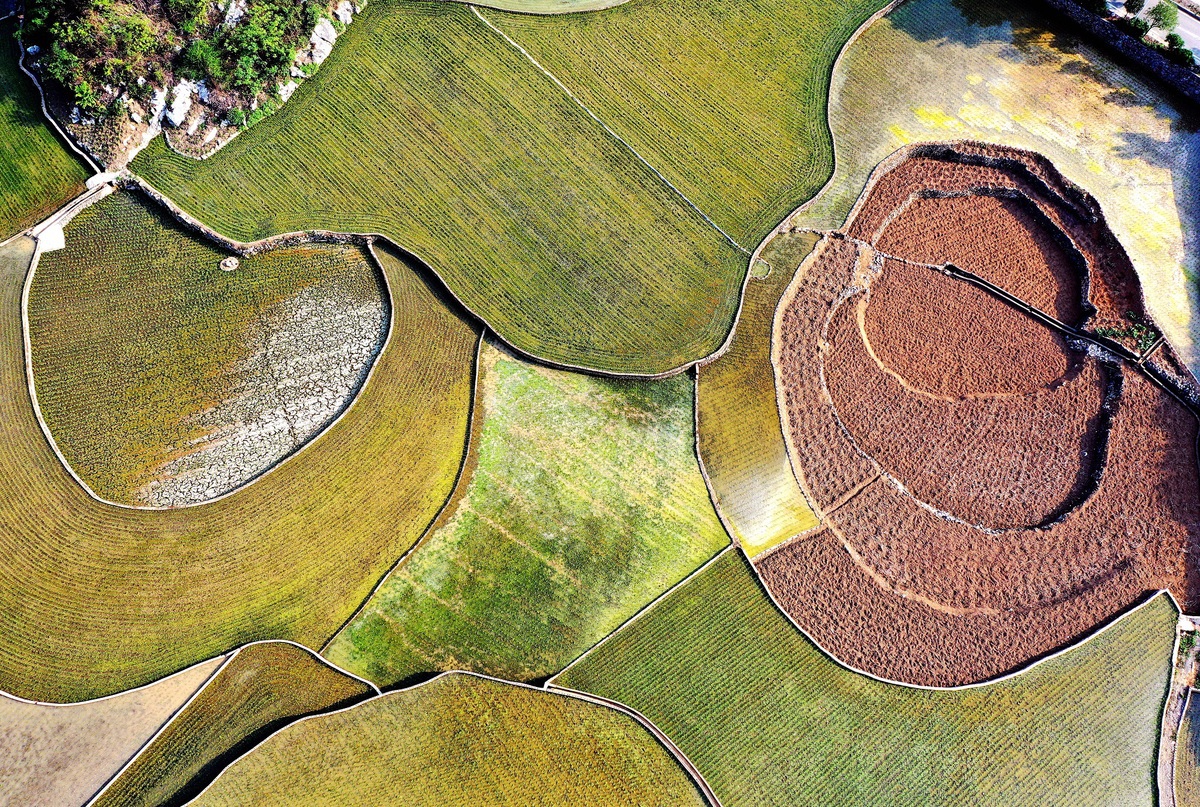 An aerial photo of rice fields at Wanfeng Forest Scenic Spot in Guizhou province look like an artist's natural color palette. [Photo by Zhang Dehou/Provided to chinadaily.com.cn]