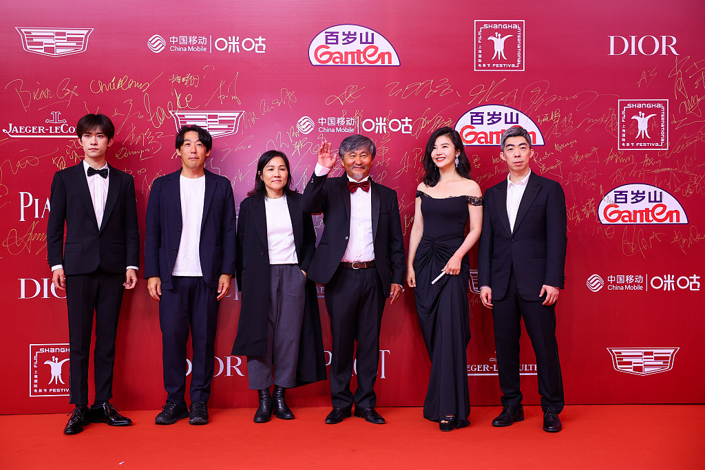 The jury of Asian New Talent category of the Golden Goblet Awards led by Kyrgyz director Aktan Arym Kubat (fourth from left) pose for a group photo on the red carpet at the opening ceremony of the 2023 Shanghai International Film Festival in Shanghai, June 9, 2023. [Photo/CGTN]