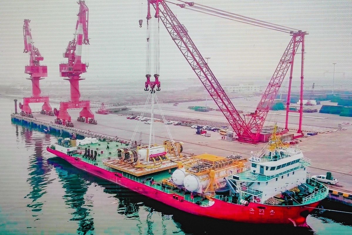 The first module of the center is hoisted onto a boat. [Photo by Wang Chenglong/For chinadaily.com.cn]