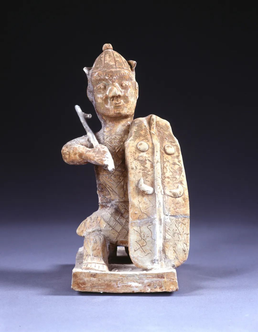 Celadon figurine holding a shield, Three Kingdoms (220-280), unearthed from a tomb in Huangpi district, Wuhan city [Photo/Official WeChat account of the Wuhan Museum]
