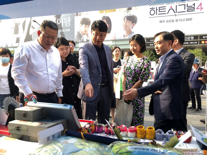 Officials from the tourism departments in Seoul pay a visit to the Taizhou booth. [Photo/WeChat ID: tztour]