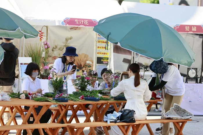 Japanese tourists learn about Guangling flower arrangement. [Photo/WeChat ID: tztour]
