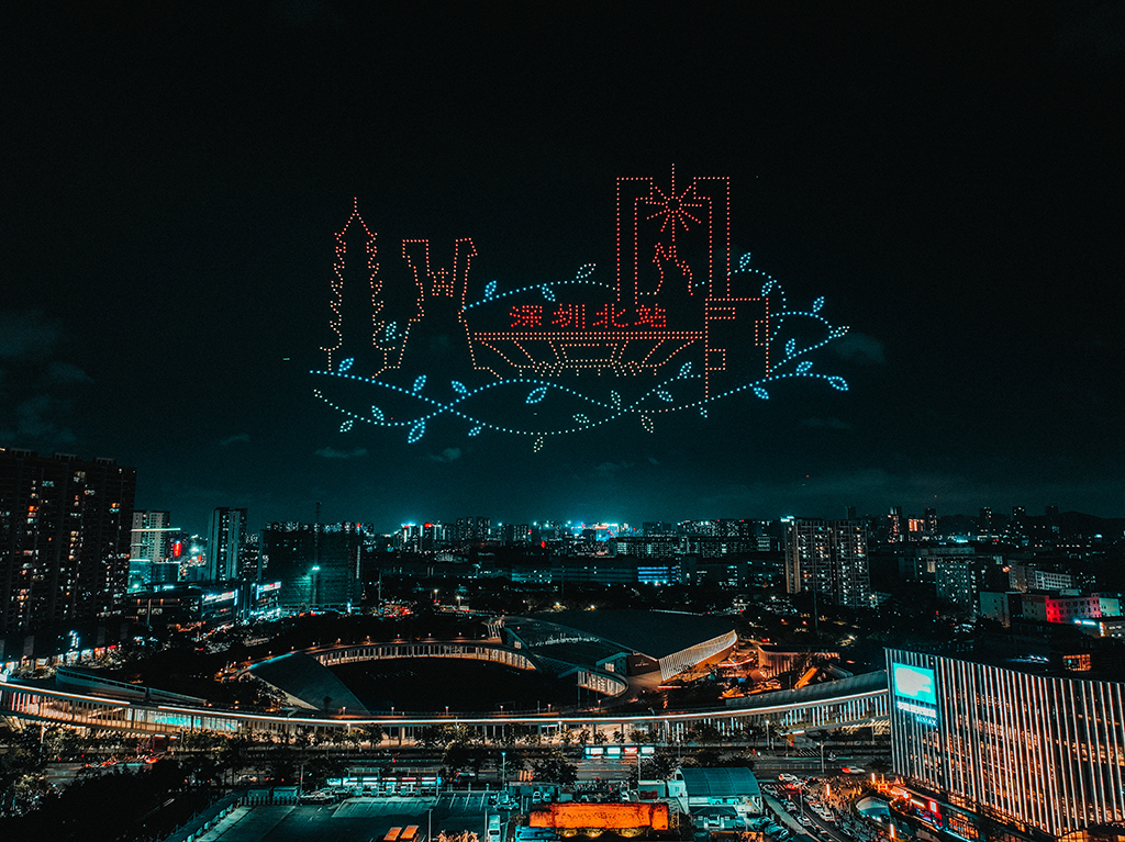 Unmanned drones create the image of Shenzhen North Railway Station and light up the sky of the Longhua Sports and Cultural Center in Shenzhen. [Photo by Chen Jianhua, Li Daohang & Zheng Mingmeng/provided to chinaservicesinfo.com]