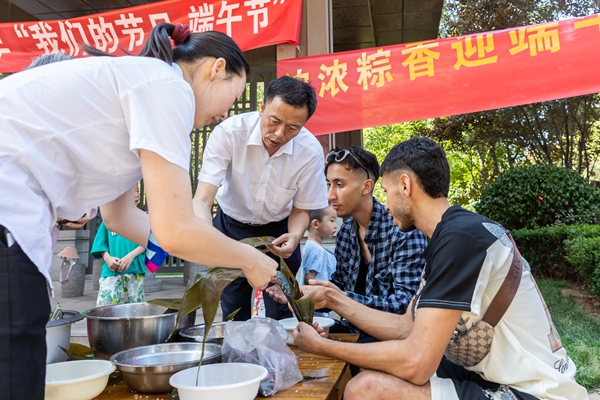 Locals teaches the Moroccan students how to make zongzi, a traditional Chinese sticky rice dumpling wrapped in reed leaves. [Photo provided to chinadaily.com.cn]