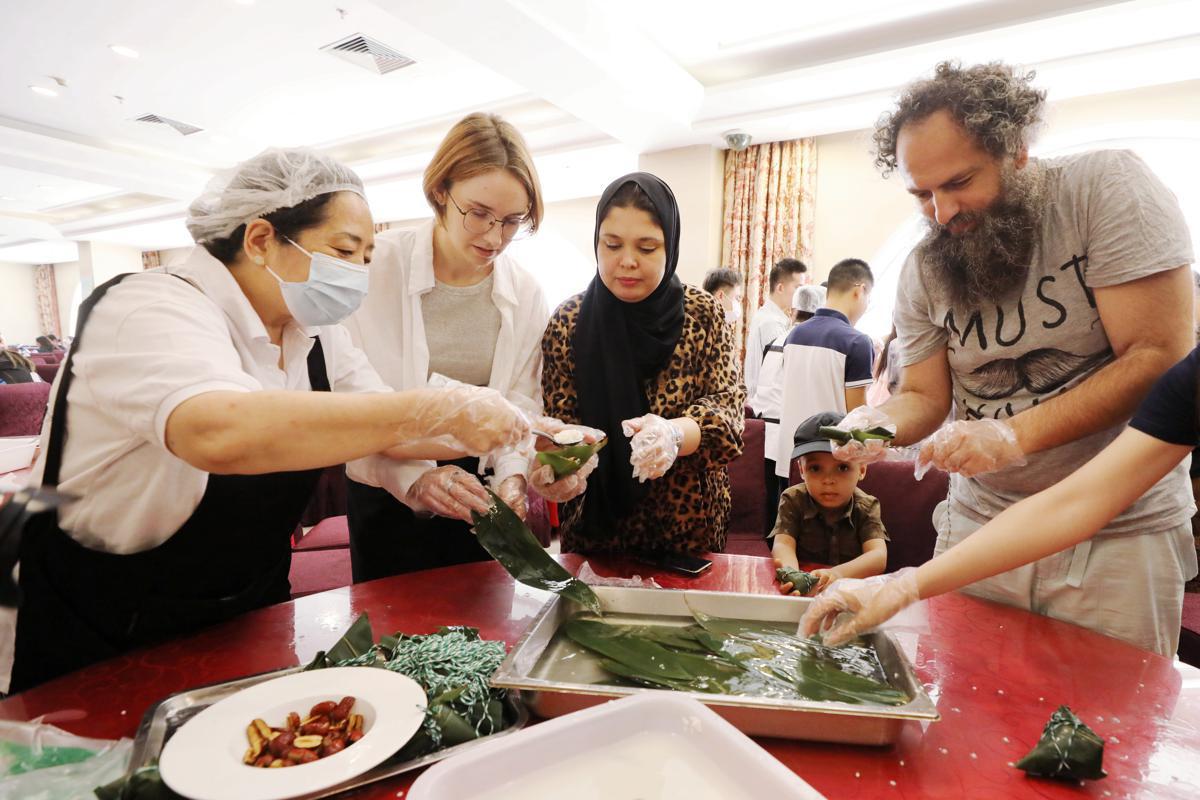 International teachers and students at Tianjin Foreign Studies University and the Tianjin University of Technology and Education made zongzi, or sticky rice dumplings, after the dragon boat event. [Photo by Yang Cheng / chinadaily.com.cn]