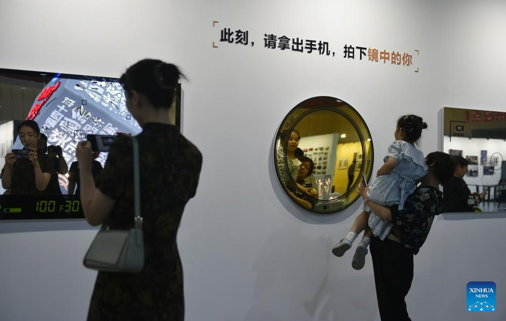 Visitors interact with an exhibit at a photography exhibition during the 14th China Photography Festival in Sanmenxia city of Central China's Henan province, June 22, 2023. [Photo/Xinhua]