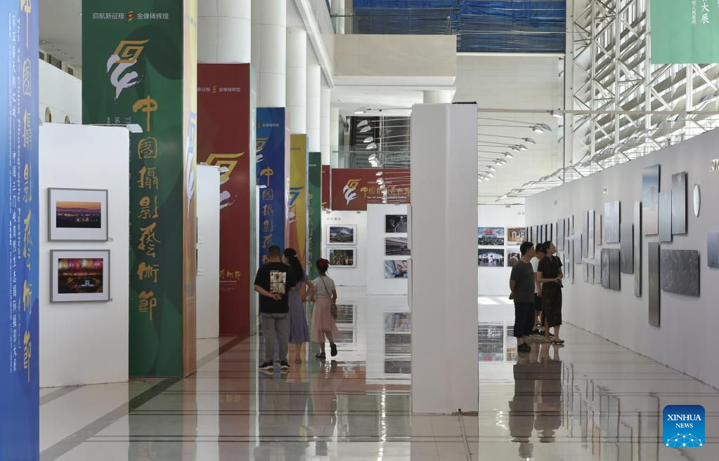 Visitors view photos at a photography exhibition during the 14th China Photography Festival in Sanmenxia city of Central China's Henan province, June 22, 2023. [Photo/Xinhua]