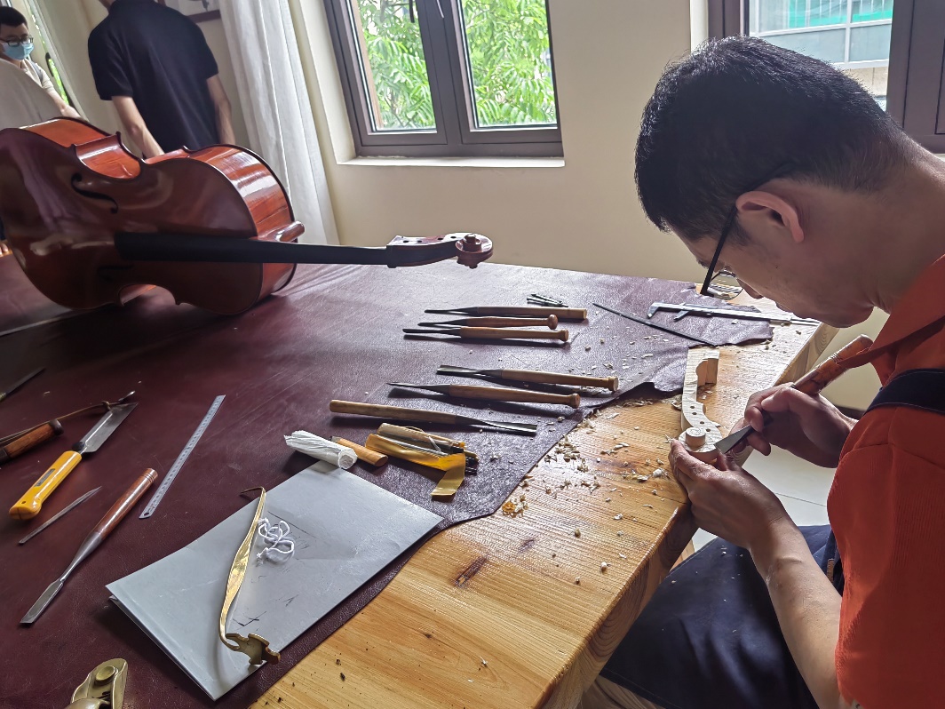 Li Guoqiang, a proficient violin maker, is absorbed in carving a violin's volute with all kinds of tools put aside as visitors come by the workshop. [Photo by Xin Siyuan/chinadaily.com.cn]