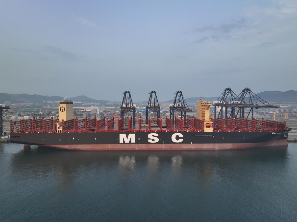 MSC Nicola Mastro, one of the world's largest 24,100 twenty-foot equivalent unit (TEU) ultra-large container ships, docked on Saturday at the Dalian Port container terminal in Jinpu New Area of Dalian, Liaoning province. [Photo by Yu Xinwen/For chinadaily.com.cn]