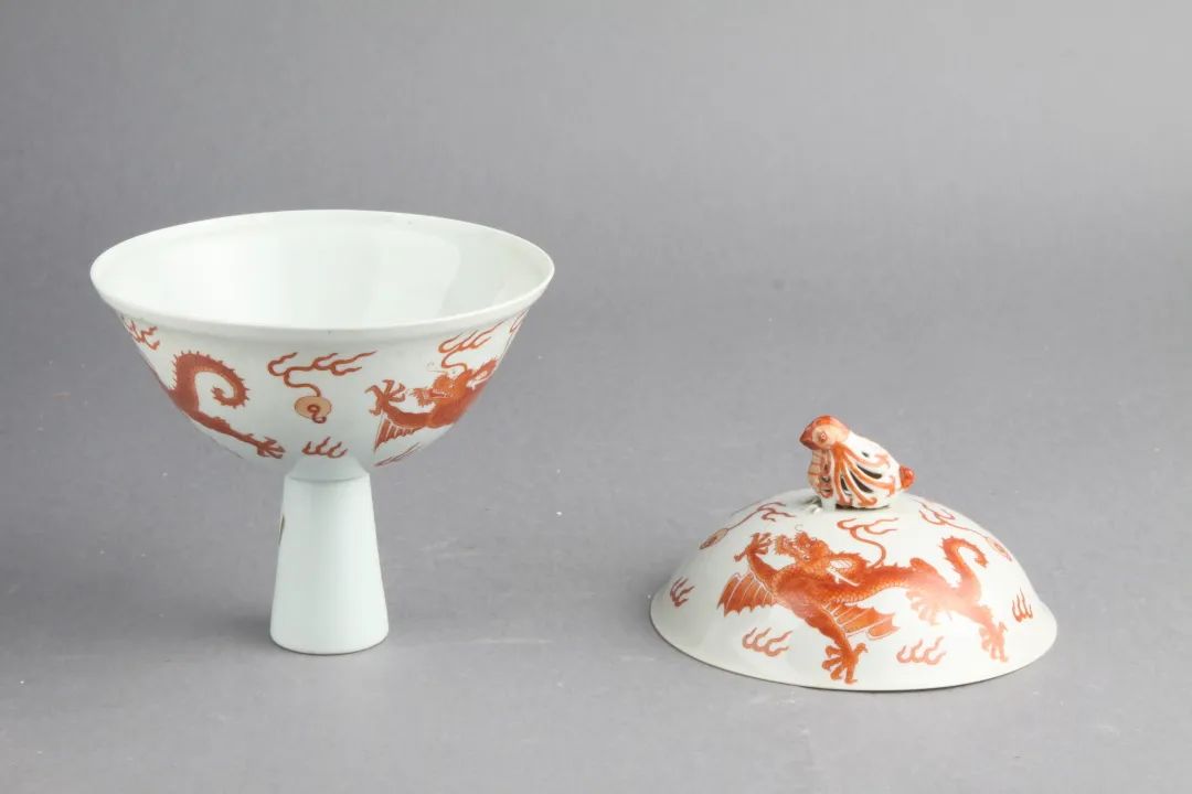 Ceramic high-foot bowl with red dragon patterns and a lid decorated with a chicken-shaped knob, Qianlong Reign (1736-95) of the Qing Dynasty [Photo/Official WeChat account of the Zhangjiagang Museum]