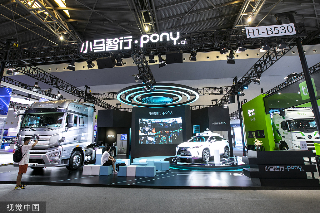 Driverless cars of Pony.ai are displayed at an expo in Shanghai on July 10, 2021. [Photo/VCG]