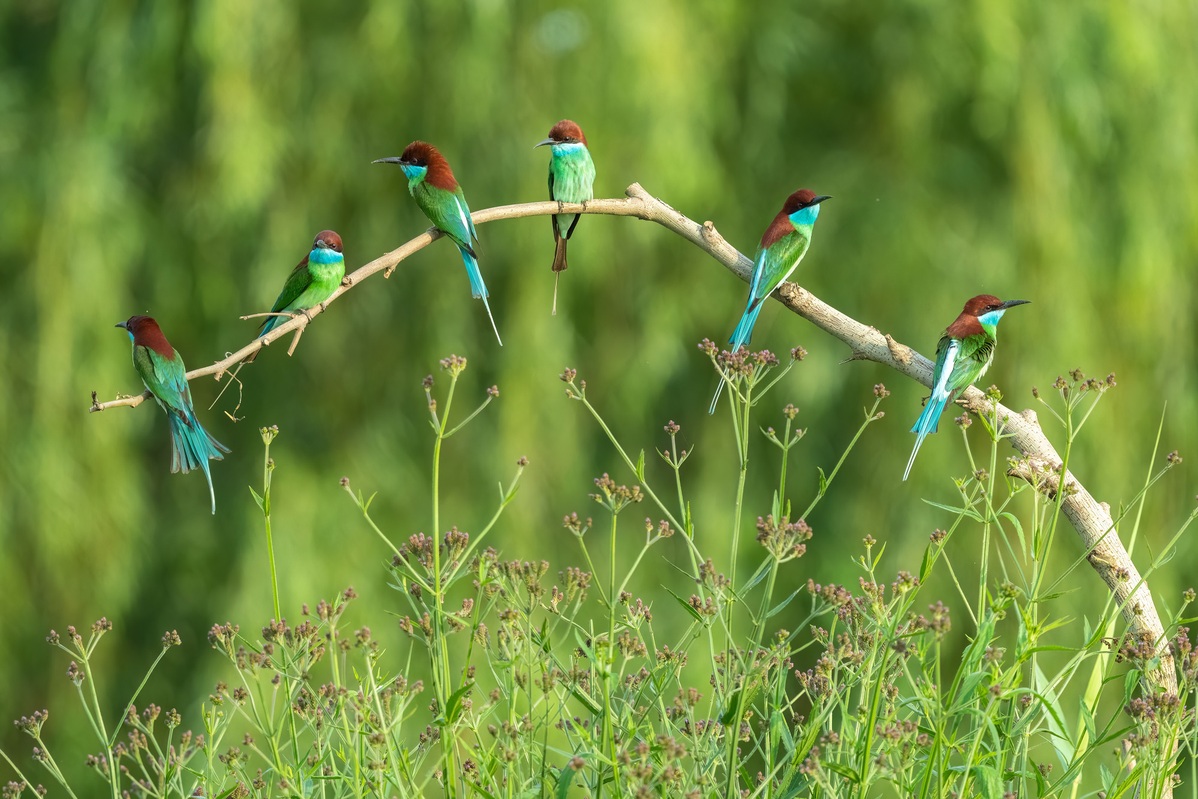 A group of blue-throated bee-eaters gathered recently on a sandbar in Xiangyang, Hubei province. [Photo by Zhang Xiaofeng/For chinadaily.com.cn]