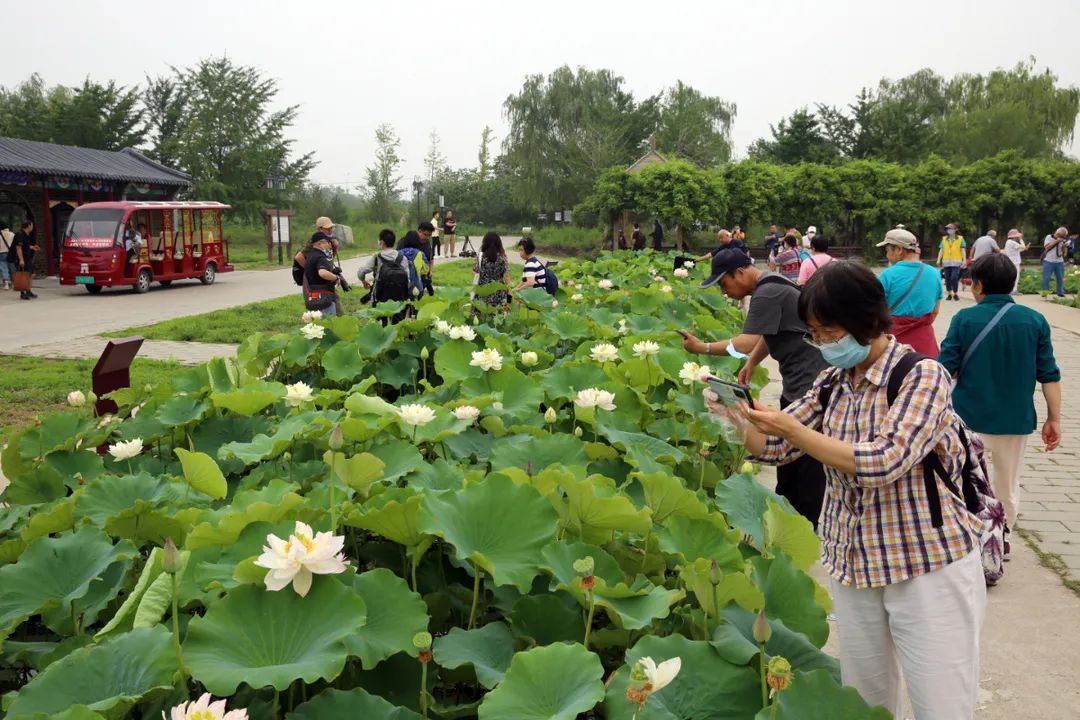 Tourists snap photos of blooming lotus flowers at Beijing’s Yuanmingyuan Park. [Photo/Official WeChat account of Yuanmingyuan Park]