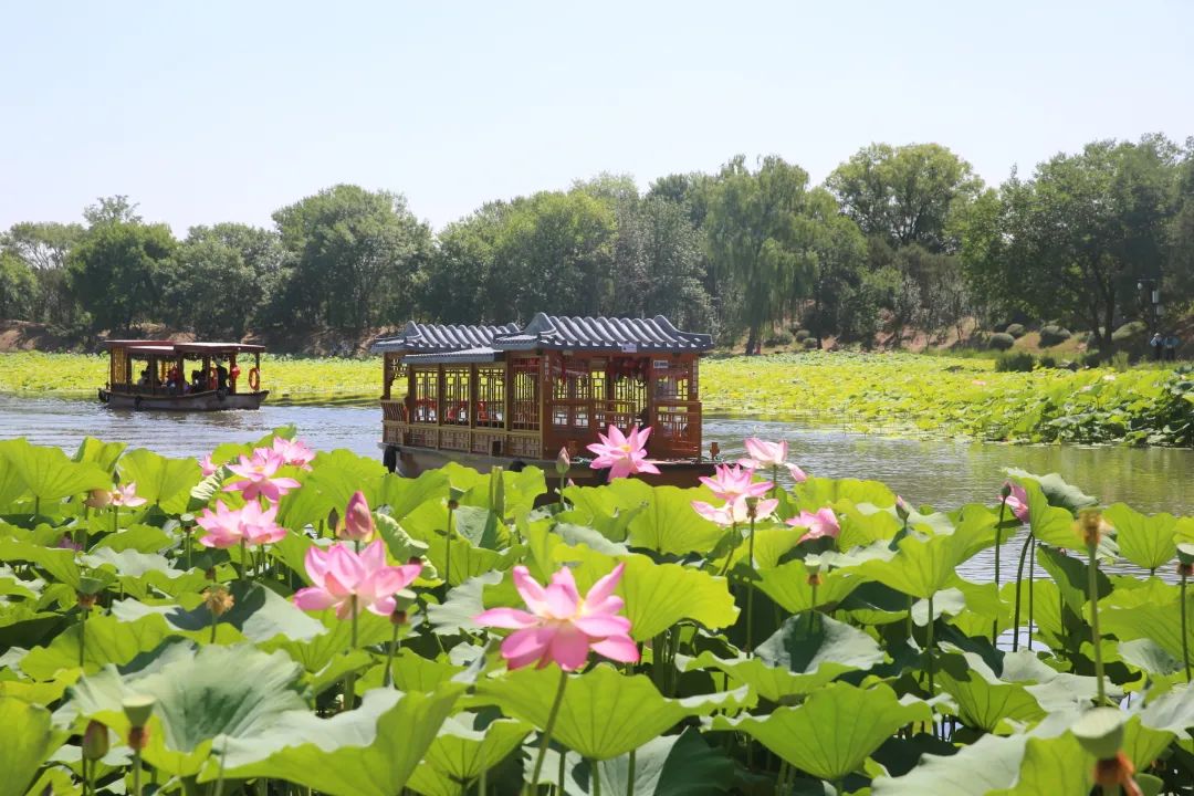 Tourists take boats to admire the beautiful view of blooming lotus flowers at Beijing’s Yuanmingyuan Park. [Photo/Official WeChat account of Yuanmingyuan Park]
