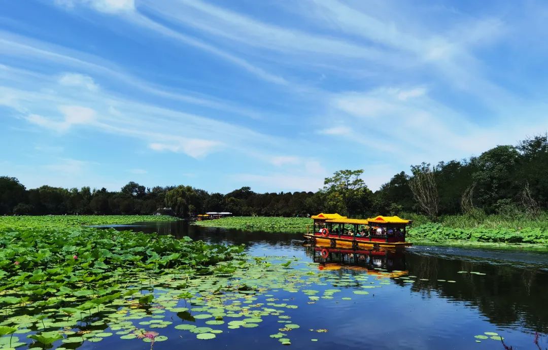 Tourists take boats to admire the beautiful view of blooming lotus flowers at Beijing’s Yuanmingyuan Park. [Photo/Official WeChat account of Yuanmingyuan Park]