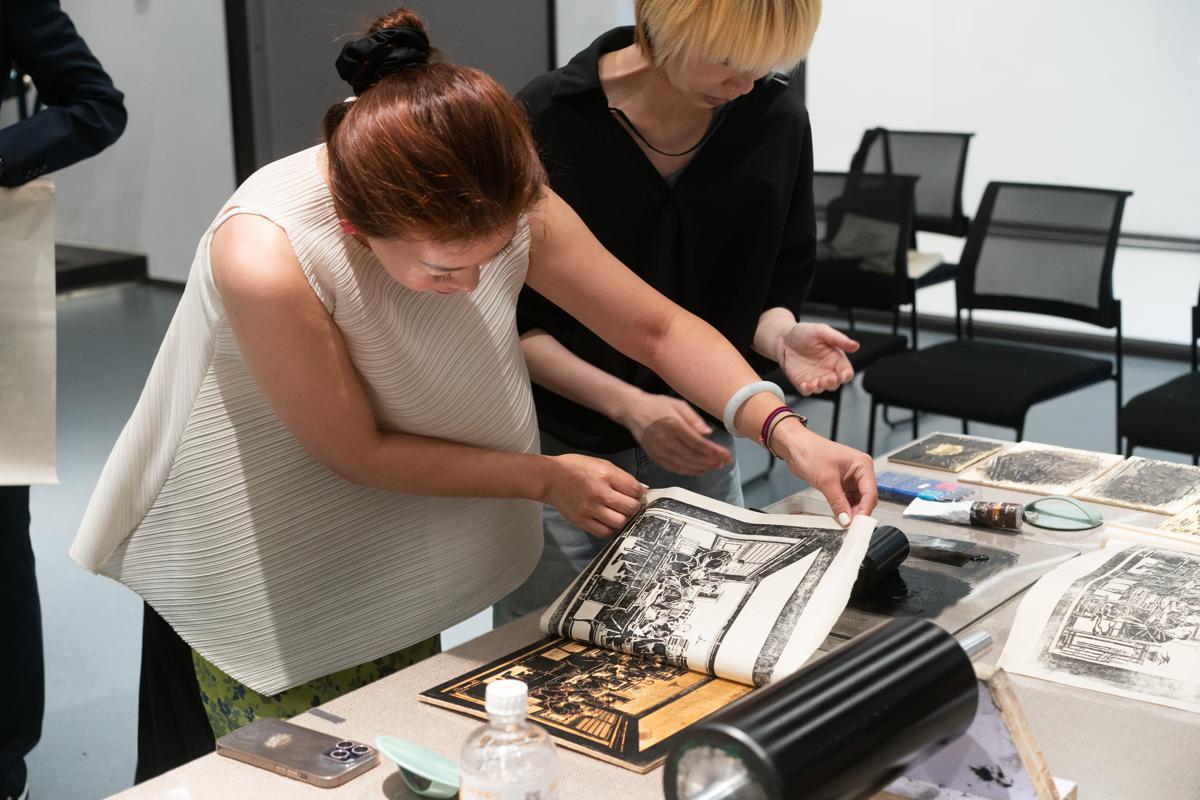 A visitor tries on wood printing at the museum. [Photo by Gao Erqiang/chinadaily.com.cn]