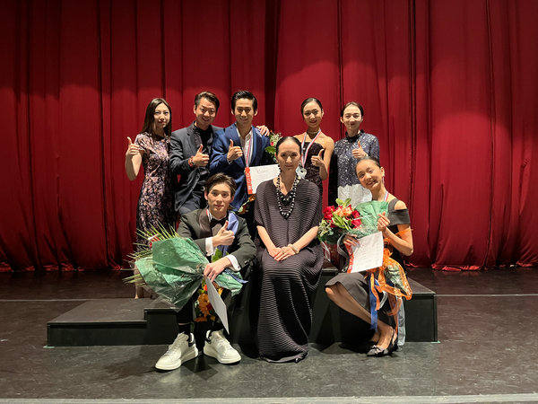 Feng Ying (middle), artistic director and president of the National Ballet of China, and the company's dancers, who won at the 12th USA International Ballet Competition. [Photo provided to China Daily]