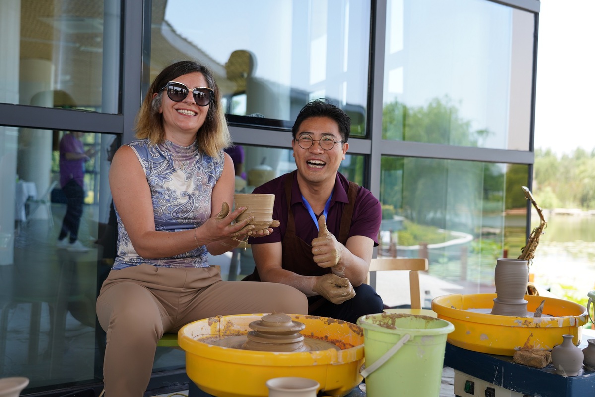 A foreign visitor experiences a ceramics-manufacturing process at a company in Tangshan, Hebei province, on June 30, 2023. [Photo provided to chinadaily.com.cn]