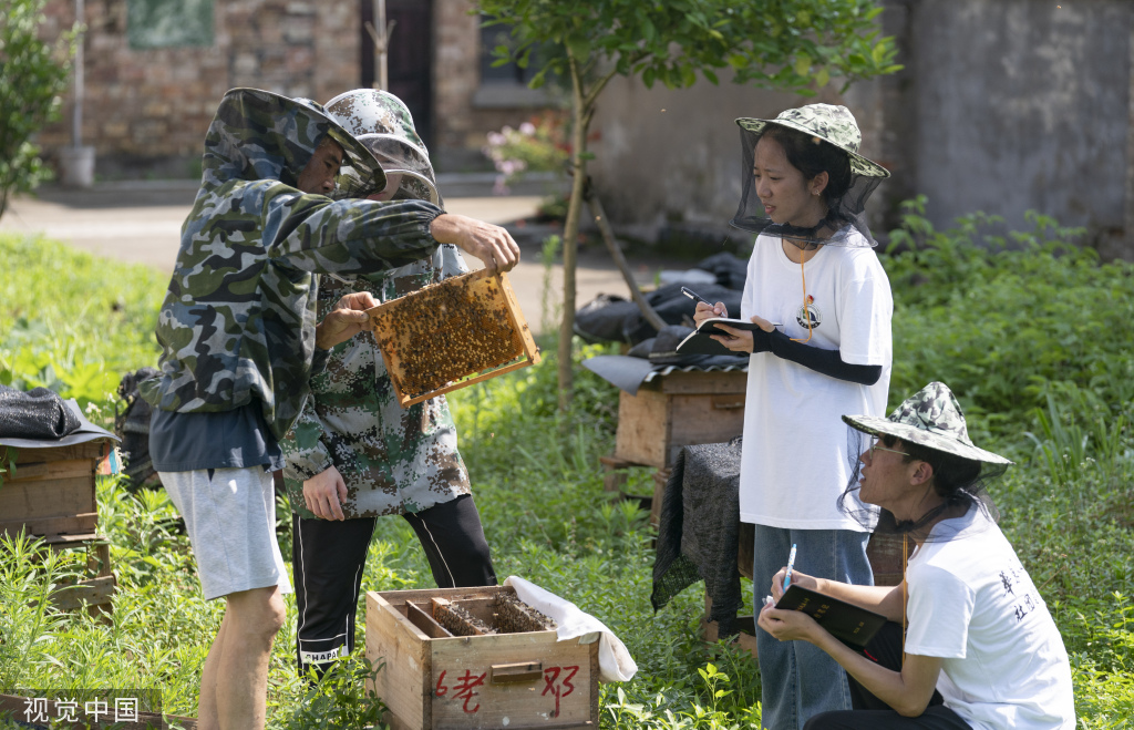College students learn about breeding and the sales of bee from farmers in Changtian village of Xinyu, Jiangxi province, July 2, 2023. [Photo/VCG]