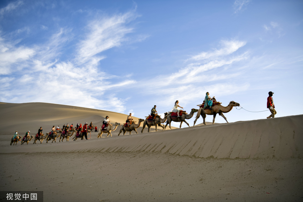 Visitors ride in the Crescent Moon Spring scenic area in Dunhuang, in Northwest China's Gansu province, July 2, 2023. [Photo/VCG]