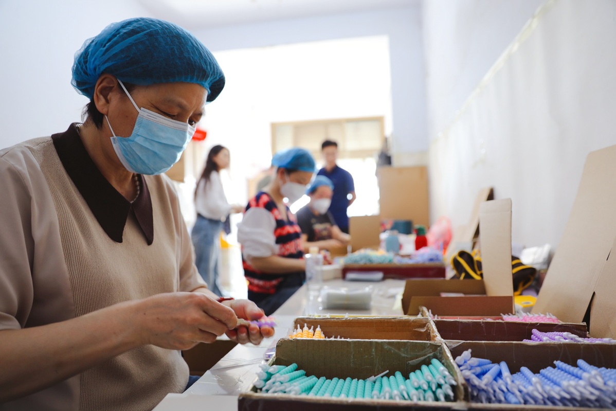 Workers of a candle maker in Dongwang town, Ningjin county, Hebei province pack candle products. [Photo by Hu Panling/For chinadaily.com.cn]