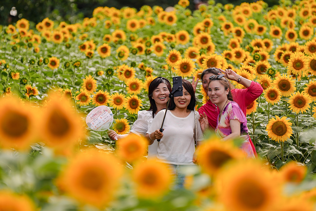 Tourists take photos amid the sea of sunflowers at Olympic Forest Park in Beijing. [Photo/IC]