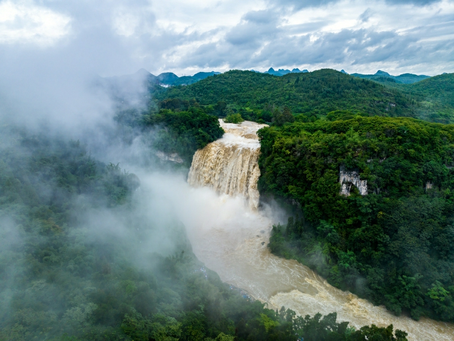 An aerial photo taken on July 4, 2023, shows Huangguoshu Waterfall in Anshun, Guizhou province. [Photo by Chen Xi/Provided to chinadaily.com.cn]