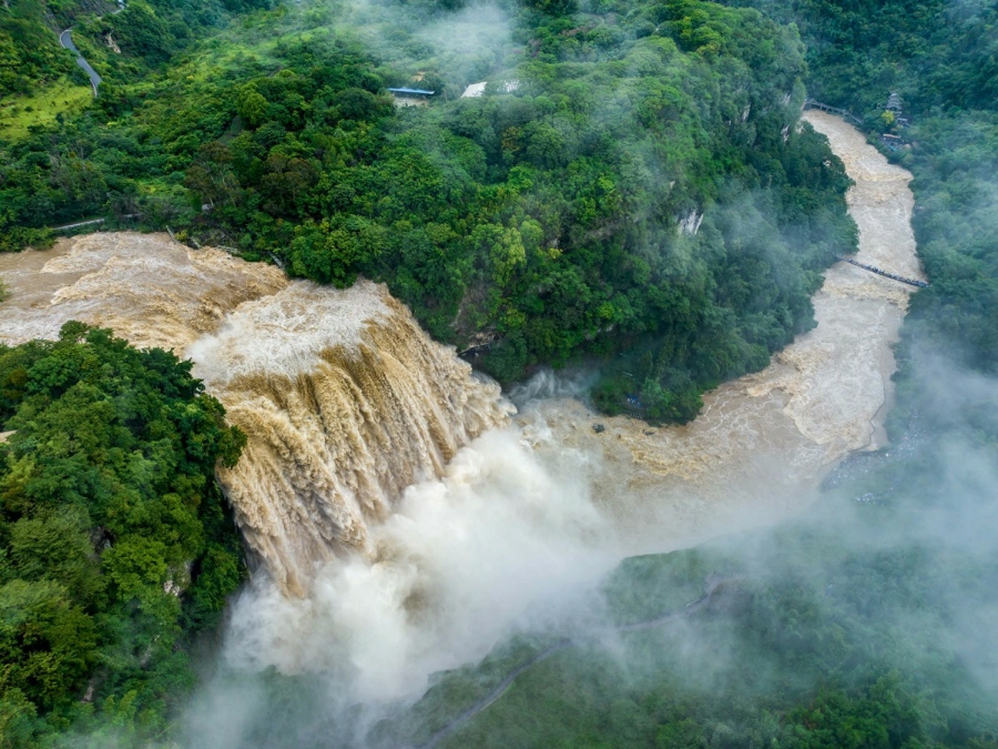 An aerial photo taken on July 4, 2023, shows Huangguoshu Waterfall in Anshun, Guizhou province. [Photo by Chen Xi/Provided to chinadaily.com.cn]