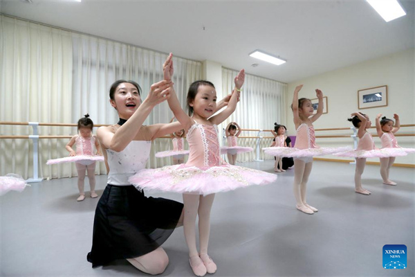 Children learn to dance at a daycare center in Dongpo district of Meishan, Southwest China's Sichuan province, July 7, 2023. [Photo/Xinhua]