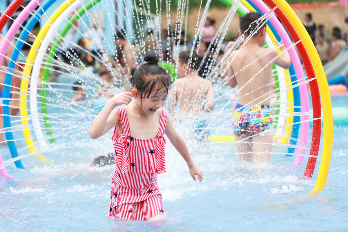 Children play at a water amusement zone in Zhenyuan county, Guizhou province, July 8, 2023. [Photo/Xinhua]