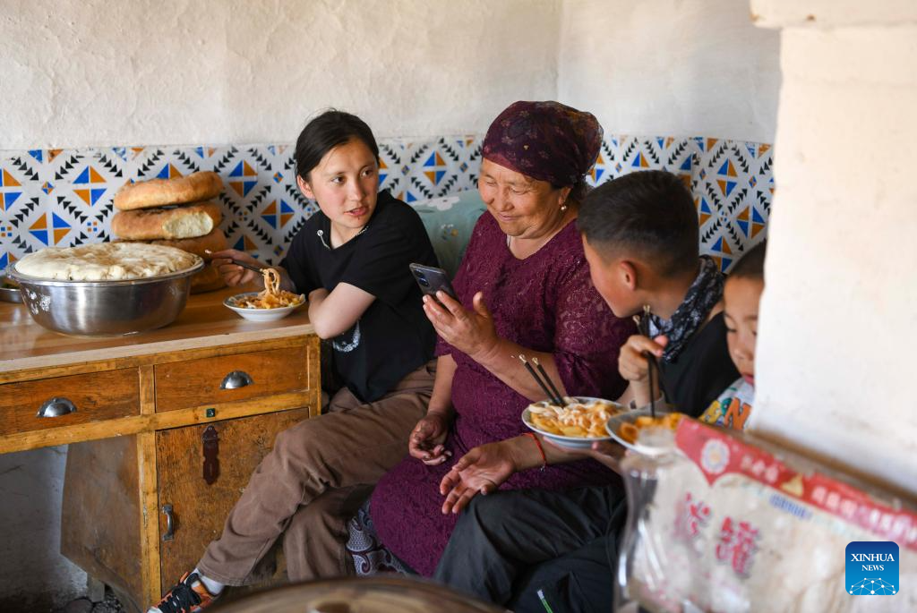 Baht Turlksi (2nd, L) chats with her little daughter Kursunak (1st, L) and nephew Zhaisang (3rd, L) at their home in Yumin county, Northwest China's Xinjiang Uygur autonomous region, July 3, 2023. [Photo/Xinhua]