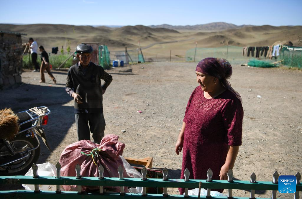 Baht Turlksi and Habudelashen Nusupbek discuss what to bring for the trip to the summer pastures in Yumin county, Northwest China's Xinjiang Uygur autonomous region, July 3, 2023. [Photo/Xinhua]