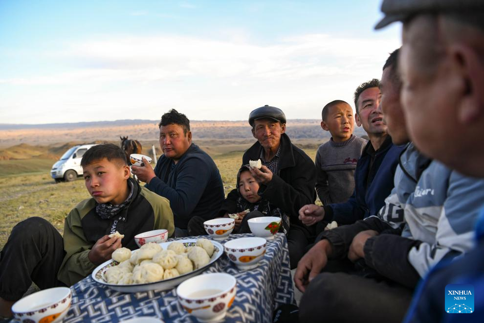 Habudelashen Nusupbek (3rd, L) and other family members have a meal after arriving at the campsite of the first day's trip to the summer pastures in Yumin county, Northwest China's Xinjiang Uygur autonomous region, July 3, 2023. [Photo/Xinhua]