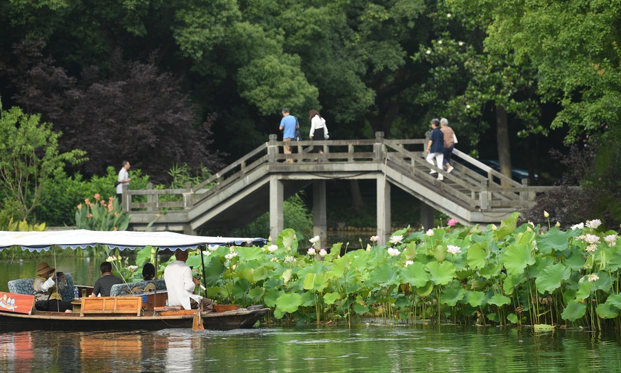 Tourists enjoy lotus flowers in the West Lake in Hangzhou, capital of East China's Zhejiang province, June 11, 2023. [Photo/Xinhua]