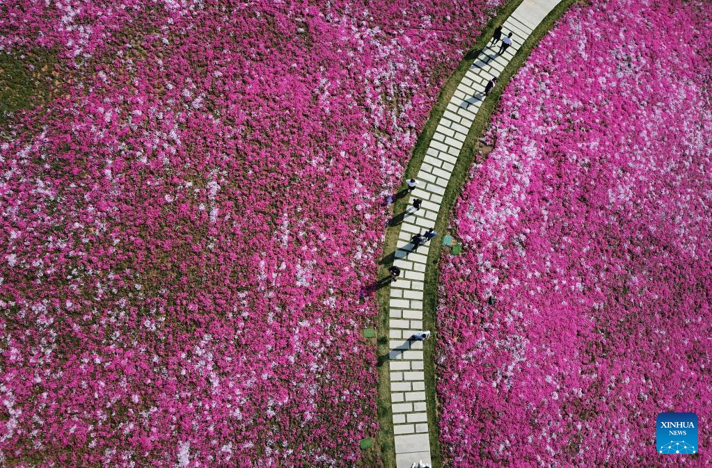Aerial photo taken on April 8, 2022 shows people viewing flowers in Jinan, East China's Shandong province. [Photo/Xinhua]