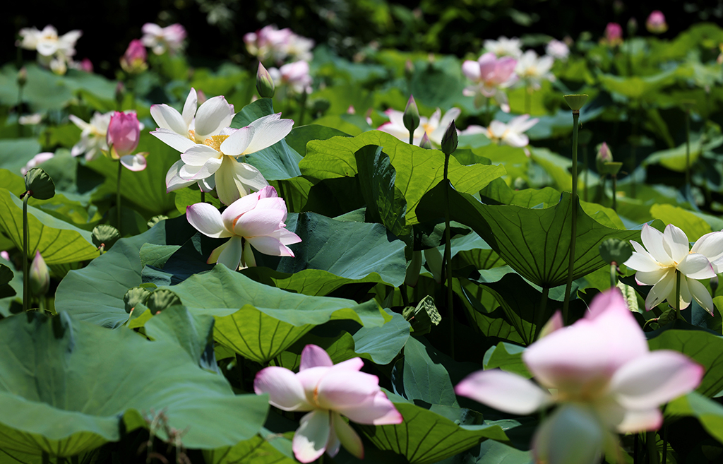 The ponds of various sizes in Lotus Hill are adorned with stunning lotus and water lily blossoms in colors such as pink, pale yellow, and white. The flower viewing season lasts from the end of June to August.